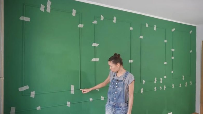 С помощью молдингов акцентную стену можно украсить следующим образом по схеме: Если между молдингами есть промежутки, их можно замазать шпаклёвкой, которую в дальнейшем также закрасить краской.
