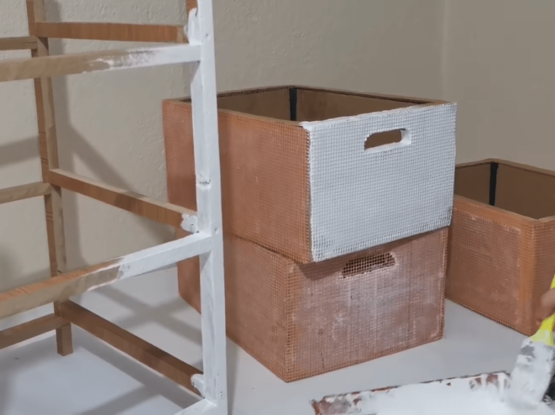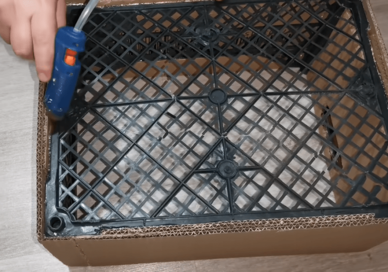 Первая задача — нарастить стенки ящиков, чтобы задать коробам правильную форму. Для этого вырезаем из упаковочного картона недостающие детали, а затем приклеиваем их в нужных местах.