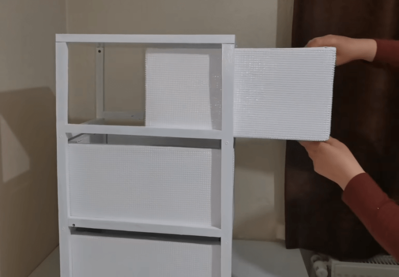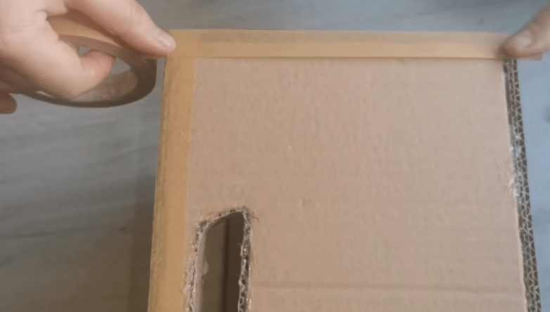Дополнительно проклеиваем картоном область ручек. Сглаживаем все стыки при помощи малярной ленты, одновременно избавляясь от щелей. Ящики станут выглядеть более аккуратными, и окрашивать их будет намного удобнее.