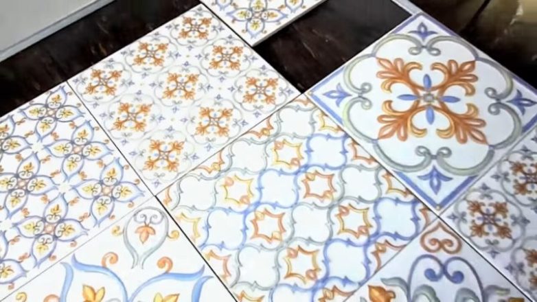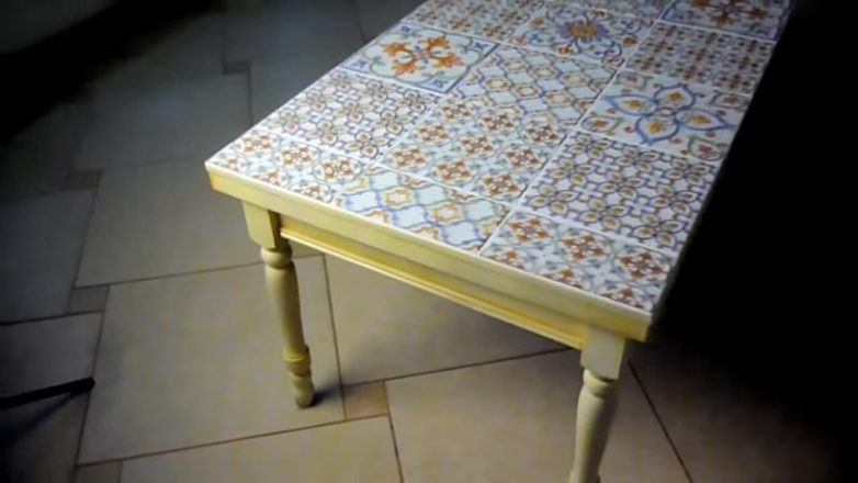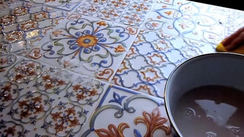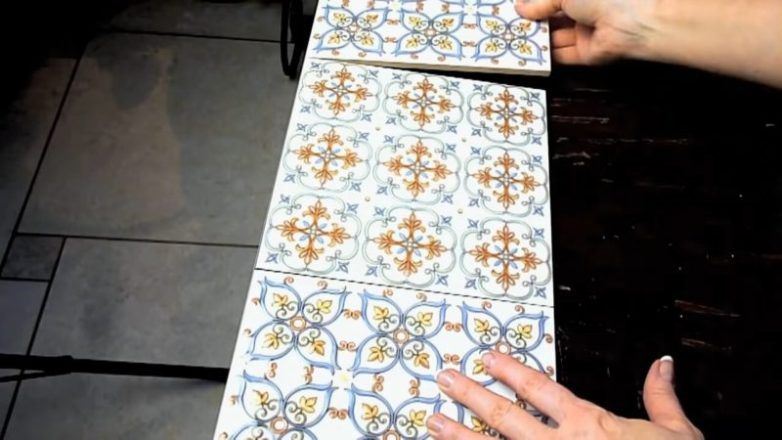 На столешницу женщина решила выложить плитку. Выбрала плитку с узором, соответствующим интерьеру комнаты.