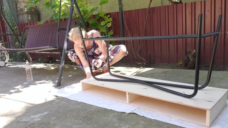 Чтобы вернуть столику первозданный вид, для начала нужно его разобрать. Верхняя часть пришла в негодность, а потому мастерица решила собрать новую своими руками. Нижнюю же часть следует зачистить от краски.