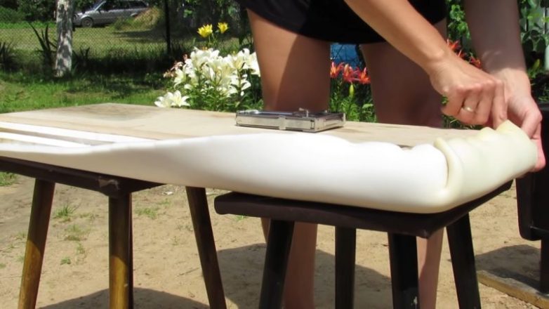 Обтянуть тканью, которую также закрепить мебельным степлером с обратной стороны.