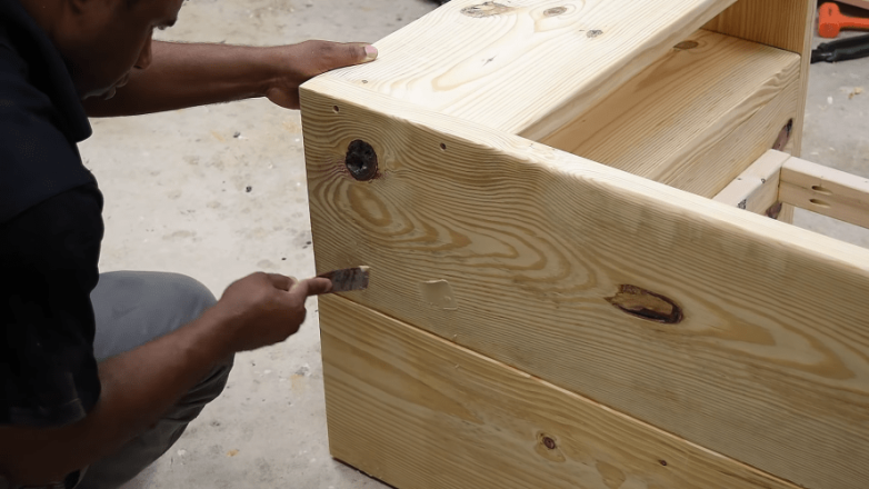 Заделываем мастикой места вхождения шурупов. При необходимости шлифуем деревянную поверхность и покрываем ее лаком. При желании на этом этапе можно изменить цвет дерева, воспользовавшись дополнительно морилкой.