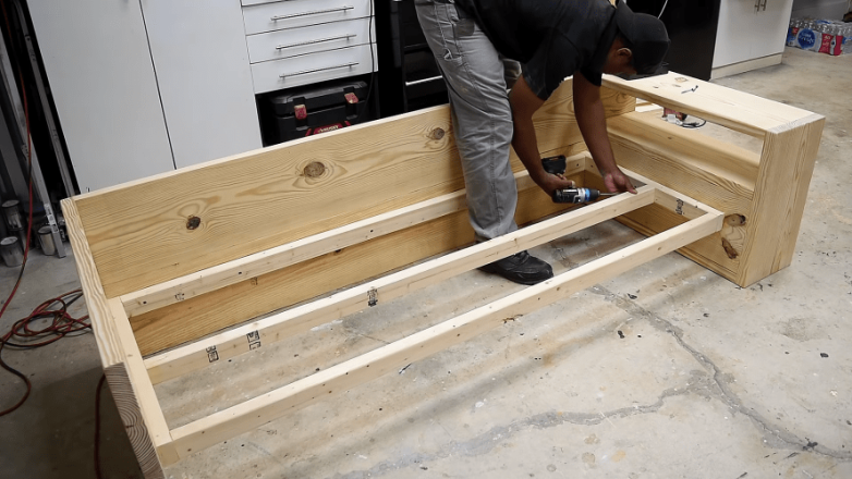 С тыльной стороны передней планки каркаса крепим добавочный брус. Высота крепления должна соответствовать высоте каркаса для ложемента.