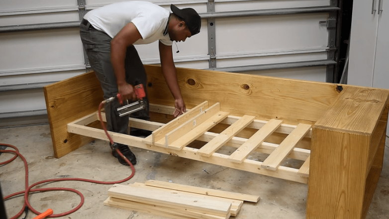Переходим к созданию основы под ложемент. На каркас из бруса укладываем тонкие доски так, чтобы между соседними досками всегда был зазор, равный толщине доски. По ходу делаем соответствующие пометки. Длина поперечных досок превышает ширину каркаса на расстояние, равное ширине бруса. Доски крепятся к каркасу через одну. Лишние при этом откладываются в сторону.