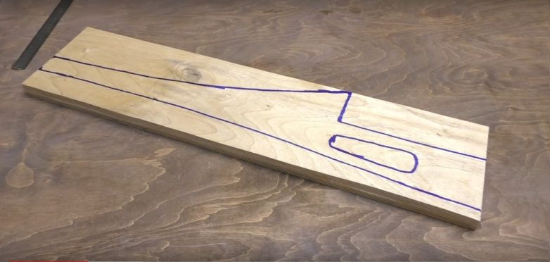 Когда клей высохнет, прорисовываем на получившемся отрезке фанеры контур ножки стола. Здесь можно немножко пофантазировать, например, в нашем случае ножка напоминает сложенный зонтик. Однако основные детали все же не должны отличаться, иначе это может повлиять на функциональность столика. Выступ на ножке нужен для опоры бутылки.