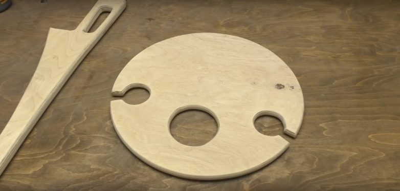Теперь готовим и саму столешницу. В нашем случае она круглая, с радиусом 13 см. Центральное отверстие предназначено для бутылки, его радиус – 4 см. Боковые отверстия – для бокалов, их радиус – 2 см, здесь же есть разъемы для ножек. Все части вырезаем, готовую заготовку также зашкуриваем и обтачиваем.