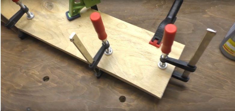 И сначала нам необходимо сделать ножку для стола. Для этого берем 2 отрезка фанеры, в нашем случае их параметры – 62X15 см. Один из отрезков хорошо промазываем клеем для дерева и склеиваем части фанеры между собой. Если есть возможность, лучше стянуть их струбцинами.