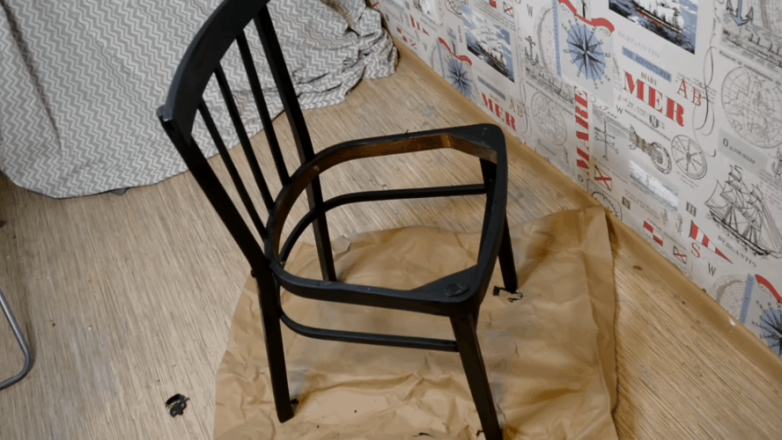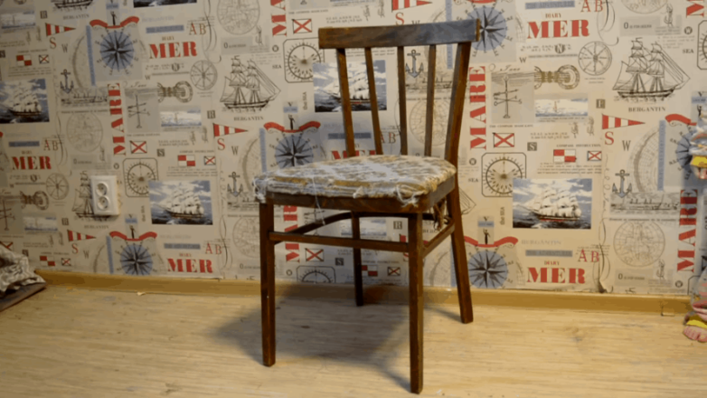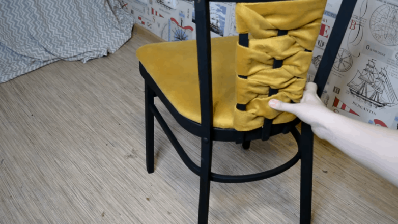 При взгляде на этот современный стул с оригинальной спинкой сложно догадаться, что еще недавно он был настоящей развалиной. Усилий для переделки понадобилось совсем немного. Материала тоже ушло по минимуму.