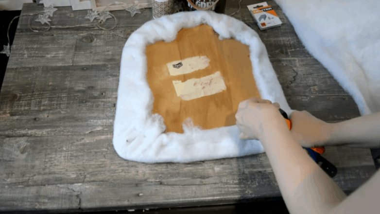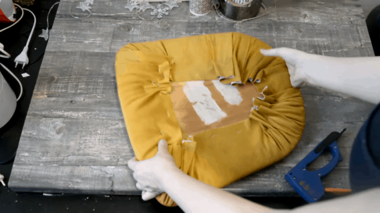 Подгибаем синтепон и крепим его к сидушке при помощи степлера, одновременно задавая форму.