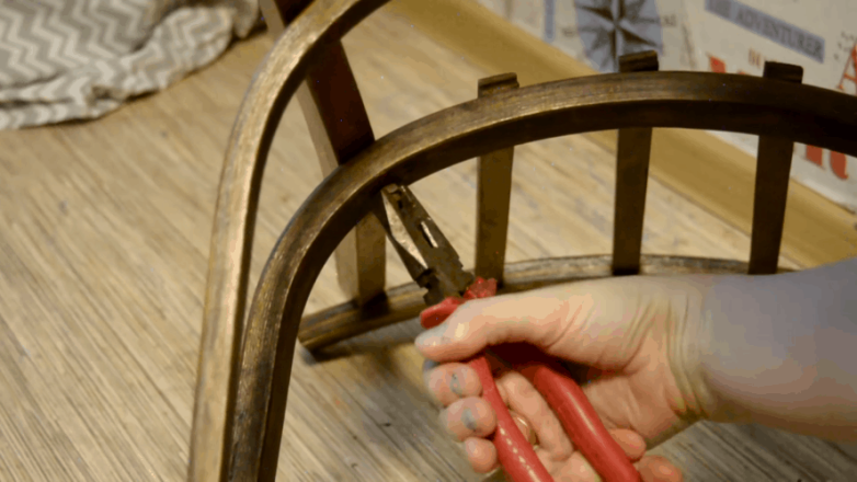Украшаем спинку при помощи все той же обивочной ткани. Из остатков делаем широкую ленту, которой должно хватить для того, чтобы обвить спинку. Закрепляем начало ленты на боковой прут при помощи клея и даем высохнуть.