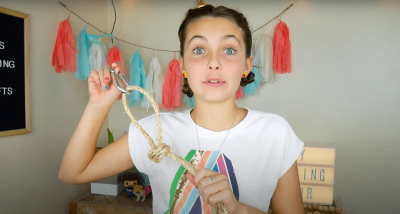 Теперь у оставленной для подвеса веревки отмечаем центр и завязываем узел, отступив примерно 20 см. У вас должна получиться петля, в которую затем продеваем карабин.