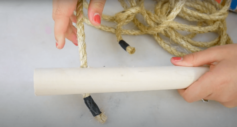 Все детали готовы и можно начинать собирать кресло. Чтобы облегчить себе работу, концы веревки обматываем, например, изолентой. Затем продеваем один из концов в первое отверстие на палке, завязываем узел.