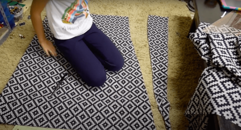 Далее берем отрез ткани и складываем его вдвое. Отступаем от края 18 см и проводим диагональ в сторону ближайшего угла. Затем отрезаем ткань по отмеченной диагонали. Обрезанная таким образом часть предназначена для сидения, необрезанная — для спинки.