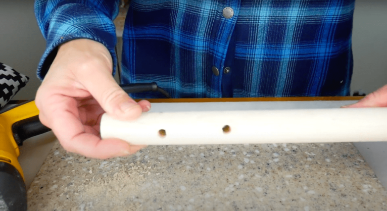 швейные принадлежностиИ для начала подготовим своеобразный каркас для кресла. Для этого берем деревянную палку длиной примерно 2 метра. Затем отступаем от края 5 см и отмечаем первую точку, отступаем от нее еще 5 см и отмечаем вторую точку. С другого конца палки делаем точно так же разметку. Затем в отмеченных местах просверливаем отверстия.