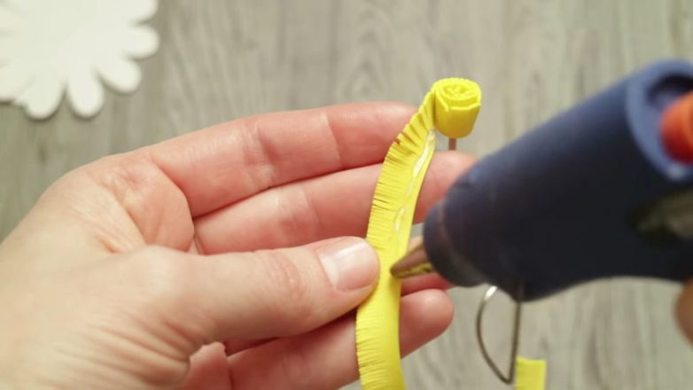 Затем с помощью горячего клея и зубочистки сворачиваем ленту.