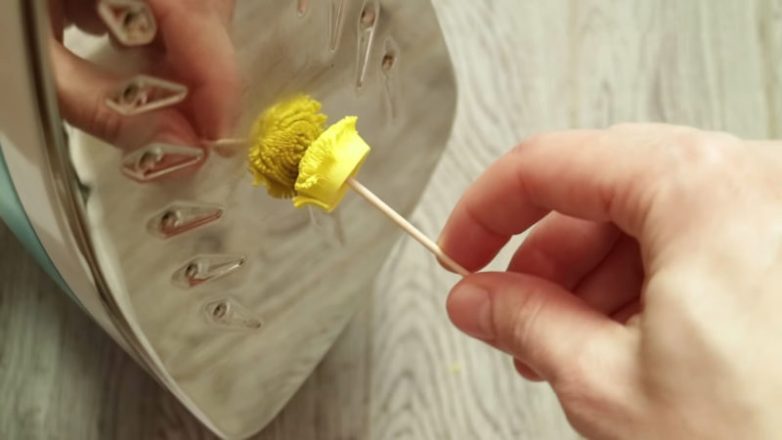 Чтобы края распушились, прислоняем сердцевину цветка ненадолго к утюгу на средней мощности.