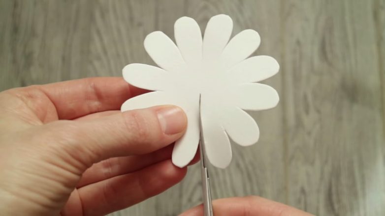 Для изготовления ромашек нужен фоамиран двух цветов — белый и жёлтый. Из белого вырезаем две одинаковые простые заготовки ромашки. Немного сильнее прорезаем лепестки ножницами, чтобы отделить их.