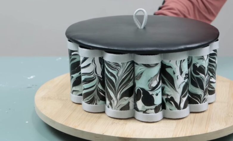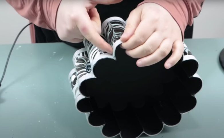 Используя горячий клей, соедините втулки между собой. Сформируйте тем самым основу корзины. Внутреннюю часть втулок покрасьте черной краской, чтобы добавить завершенность изделию.