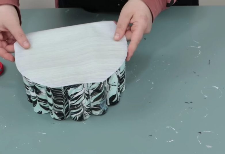 Излишки картона аккуратно срежьте. Чтобы дно корзины выглядело эстетично, оформите его самоклеящейся бумагой.