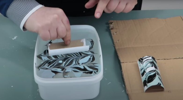 В небольшой емкости распределите краску нескольких оттенков по поверхности воды. С помощью деревянной палочки создайте интересный узор, который придаст втулкам уникальный вид. Осторожно обмакните подготовленные втулки в краску и разместите их на ровной поверхности до полного высыхания.