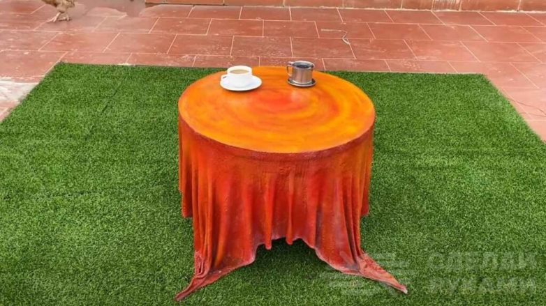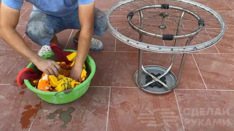 Чтобы сделать столик на дачу, можно использовать подручные средства. Например, в данном обзоре автор расскажет, как сделать круглый столик из велосипедного колеса, куска ткани и цемента.
