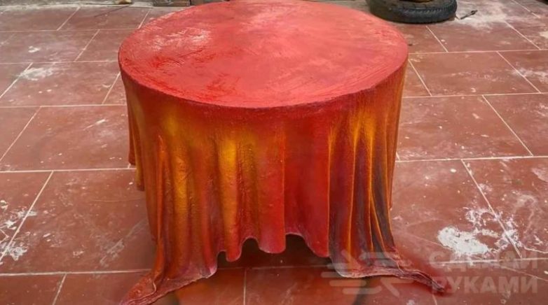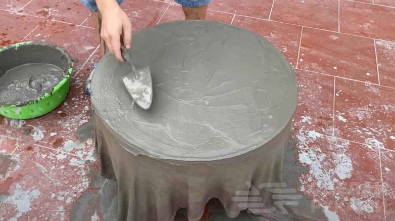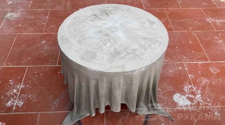 Переворачиваем табуретку с ободом вверх ногами. Далее отрезаем подходящий по размеру кусок ткани, и замачиваем в жидком цементном растворе.