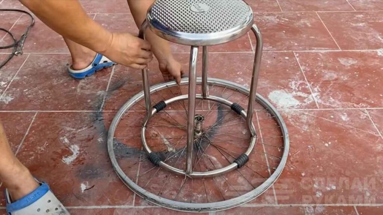 Первым делом снимаем покрышку с камерой. Потом отрезаем спицы возле втулки. С помощью проволоки крепим обод колеса к нижней части (основанию) металлической табуретки.