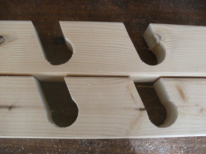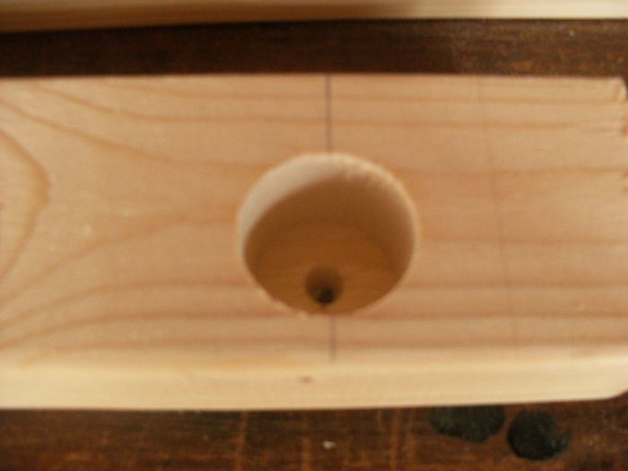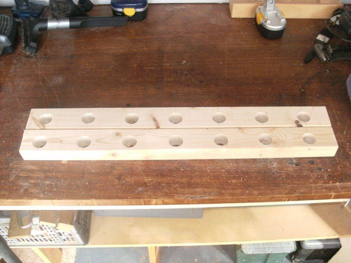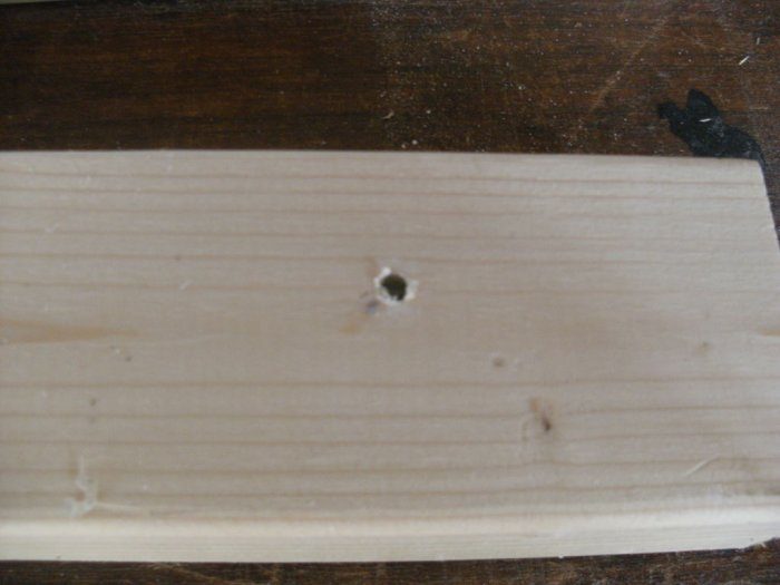 Когда все размечено, берем перьевое сверло и сверлим все отверстия, но не сквозь. Если сразу сделать сквозное отверстие, то кромка, где вышло свело будет не ровной, а будет с торчащими щепками.