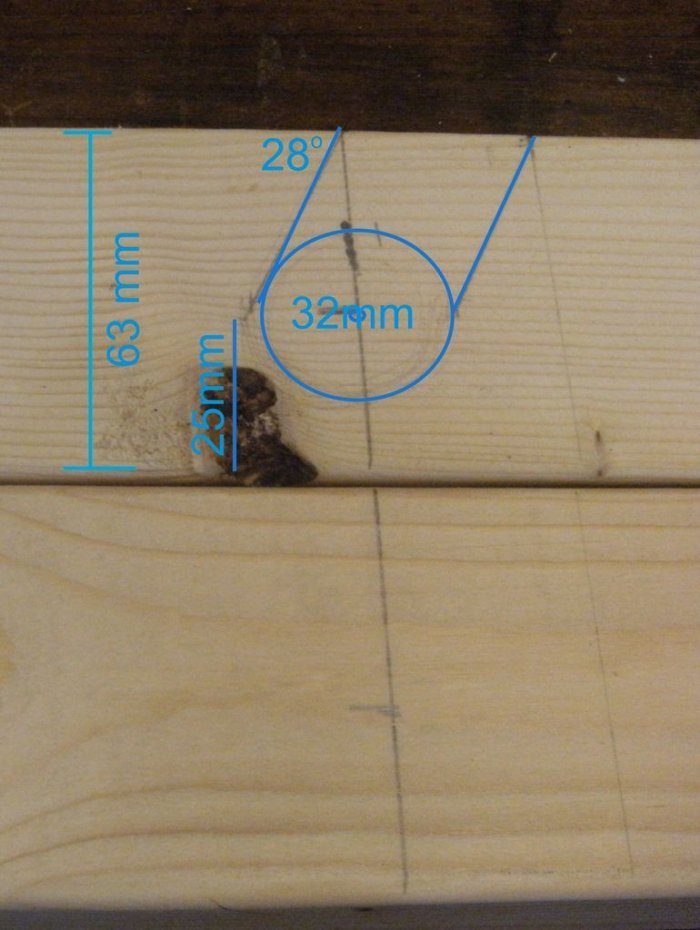Размечаем. Нужно будет сделать сначала отверстие, а потом косой срез. Расстояние между такими гнездами — 150 мм.