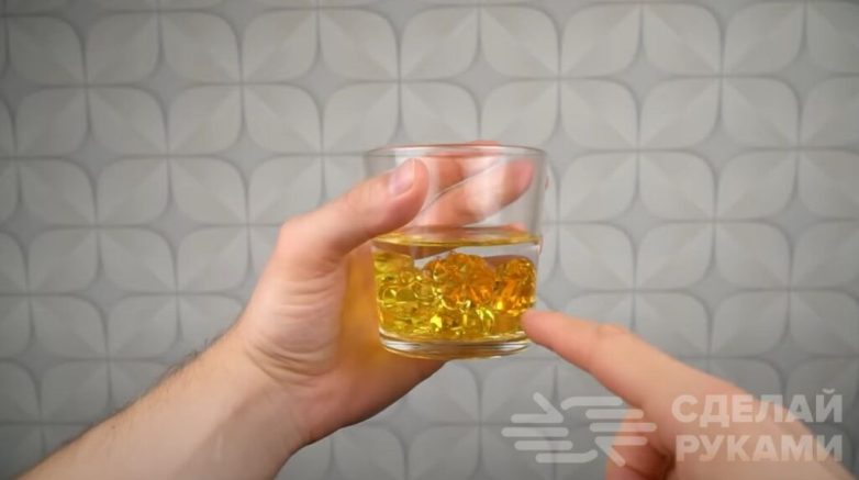 Первым делом подходящую по размеру стеклянную емкость. Обычная банка из-под горчицы будет смотреться неуместно, поэтому лучше всего взять стакан. На дно емкости укладываем небольшое количество красивых «стекляшек» или морских камушков для декора и заливаем водой, чтобы она только покрывала декоративные элементы.