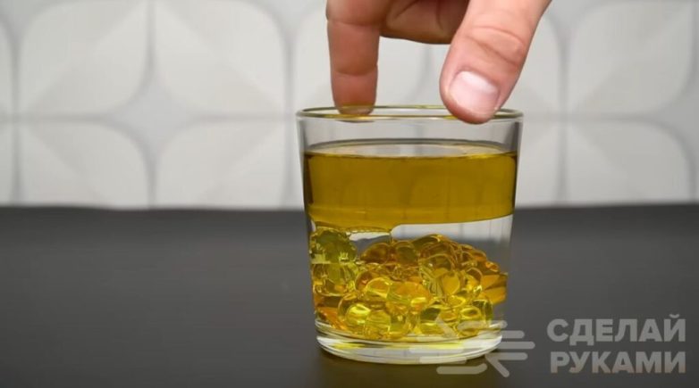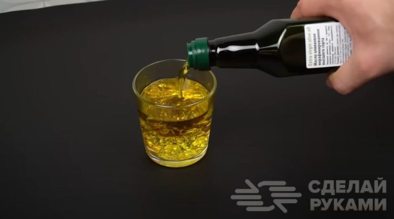 Основные этапы работБерем оливковое или подсолнечное масло и наливаем его поверх воды. В результате получится красивый эффект «слоеного пирога».
