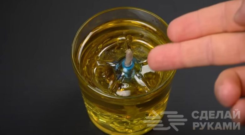Продеваем фитиль в отверстие в «плавающей» платформе, смачиваем в масле верхний конец, потом погружаем в масло нижний.