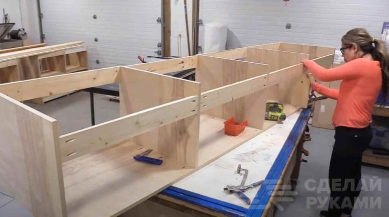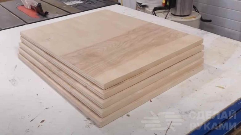 Первым делом необходимо подготовить заготовки, из которых будет собираться каркас. Автор использует фанеру и доски. Сверлим в них отверстия под косой шуруп.