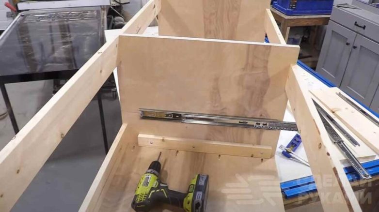 После этого прикручиваем мебельные направляющие и изготавливаем выдвижные ящики.