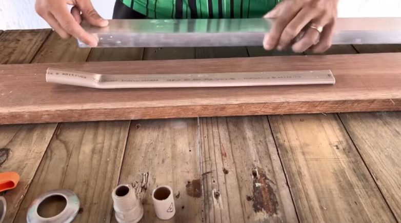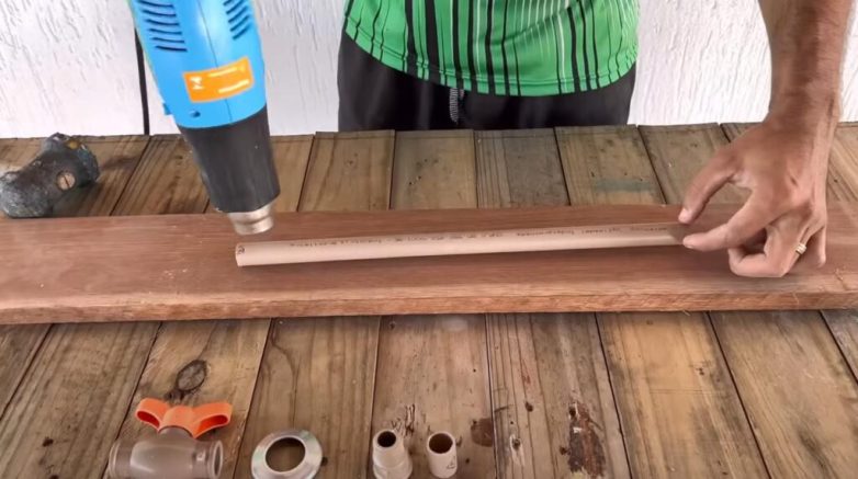 Первым делом отрезаем кусок ПВХ трубу требуемой длины. Нагреваем заготовку строительным феном, после чего сплющиваем часть трубы с помощью профиля.