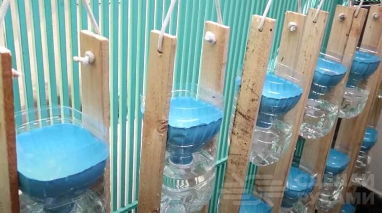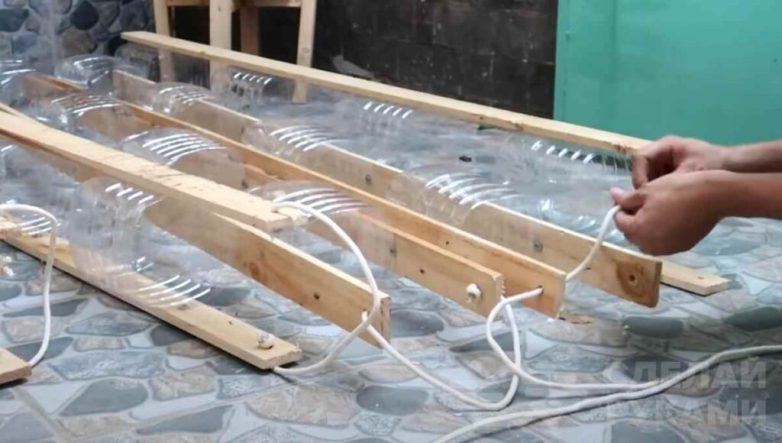 Теперь нужно будет подготовить доски подходящей длины. Крепим к ним нижние части бутылок (накопители для воды) на определенном расстоянии друг от друга.