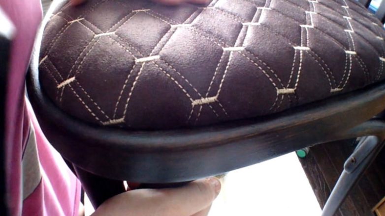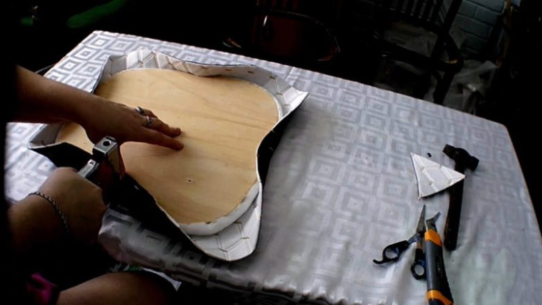 Сиденье можно сделать мягким. Для этого к нему следует приклеить поролон с небольшим запасом по краям. Промазать край поролона клеем, загнуть к обратной стороне сиденья.