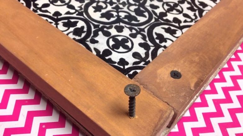 По краям отмерить рамку по ширине брусков. Выбрать шаблон — узор будущего стола, с помощью копирки перевести на поверхность.