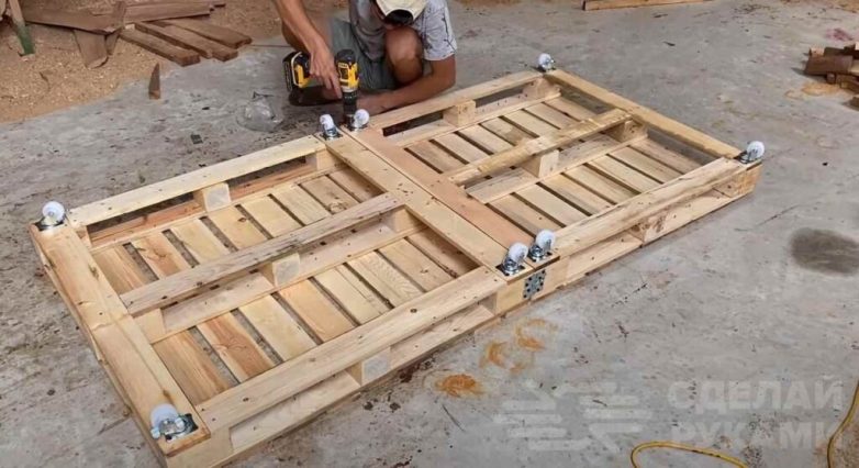Первым делом необходимо будет изготовить основание конструкции — площадку на колесиках.Для этого нам потребуется два поддона. Сверлим в них отверстия, и соединяем друг с другом при помощи деревянных шкантов.