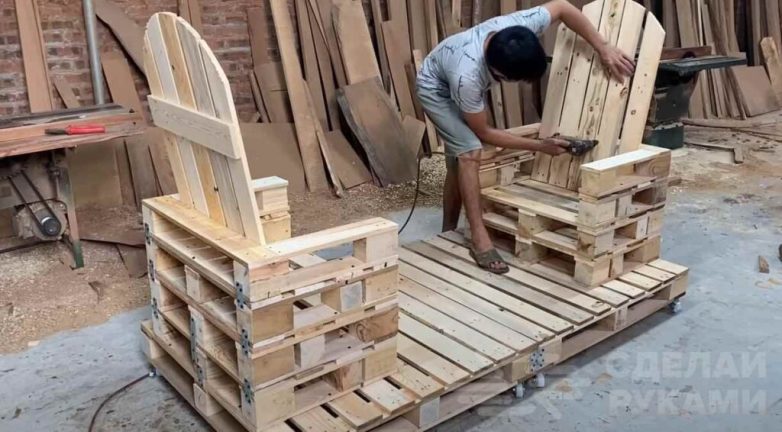 Из деревянных поддонов меньшего размера автор изготавливает два стула. Крепим их по краям площадки, установив напротив друг друга. Из отпиленных по размеру досок делаем спинки.