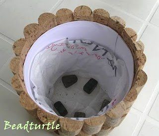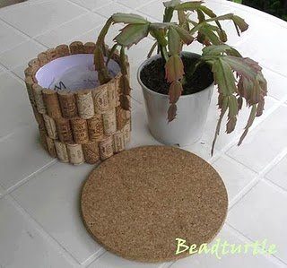 Для этого горшка основой было пластиковое ведёрко от квашеной капусты из супермаркета (его видно на первом фото), ведёрко обрезалось до требуемой высоты и оборачивалось листом картона, сложенным пополам, хотя наверно можно и прямо на пластик пробки клеить, но мне подумалось, что на картоне они прочнее держаться будут.
