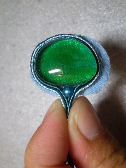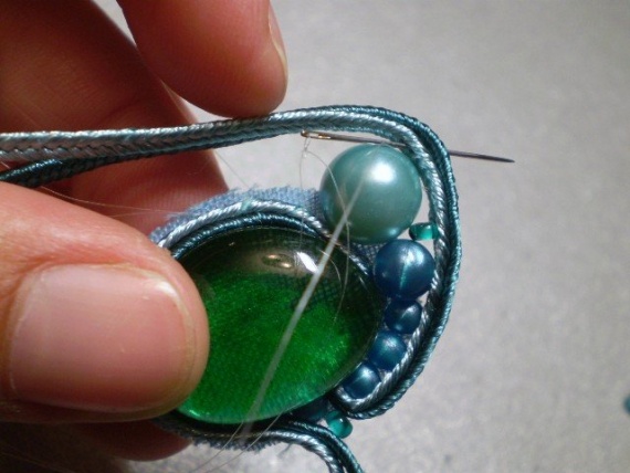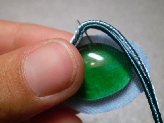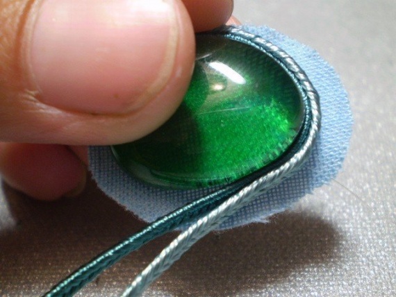 Теперь возьмем наш кабошон, который предусмотрительно наклеили на кусочек материала, и пришиваем тесьму к нему по кругу.