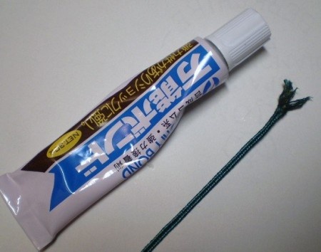 Берем два сутажных шнура и хорошенько смазываем клеем у основания. Теперь прикладываем их друг к другу и делаем при помощи иголки пару стежков.