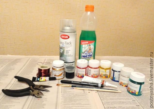 Ну вот, почти все готово. Черным акрилом обновляем железные части лампы. А элементы ножки лампы красим в бронзовый цвет, для этого пригодится плоская кисточка. Краска наносится легко и сохнет быстро.