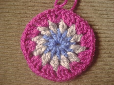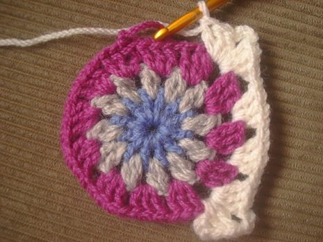Теперь возьмем основной цвет в нашем случае белый. Наберем три воздушные петли подъема, в ту же петлю провяжем два столбика с накидом, сделаем три воздушные петли и снова три столбика с накидом в ту же петлю, тем самым формируя угол квадрата. Таким образом вяжем каждую третью петлю круга, для остальных петель повторяем узор предыдущего ряда.