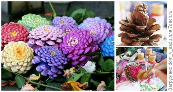Вы удивитесь, но сосновые шишки, перевернутые вверх ногами, очень похожи на цветки циннии. Нужно только взять художественные акриловые краски (они лучше всего ложатся на неровные поверхности и не смываются) и расписать эти чудесные природные заготовки.