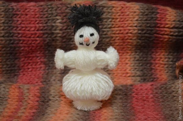 Если даже в доме нет игрушек, но есть пряжа для вязания, всегда можно придумать, как развлечь ребенка. Буквально вчера я написала про куклы из ниток и сегодня сделала обещанного снеговика (немножко не ко времени, но очень уж мне нравятся снеговики во всех их проявлениях).