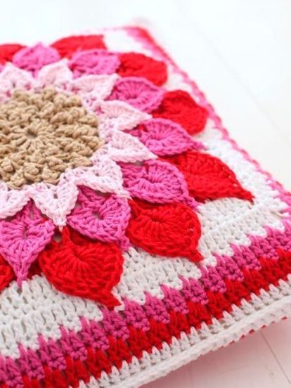 У меня есть много остатков пряжи разных цветов, которые я хочу пустить в дело. Узор для вязания я выбрала достаточно сложный, но оригинальный. Это мотивы в форме квадратов с объемным цветком по центру. Квадраты будут разноцветными, а цветы — белыми с желтой серединкой. Думаю, такая подушка понравится всем!