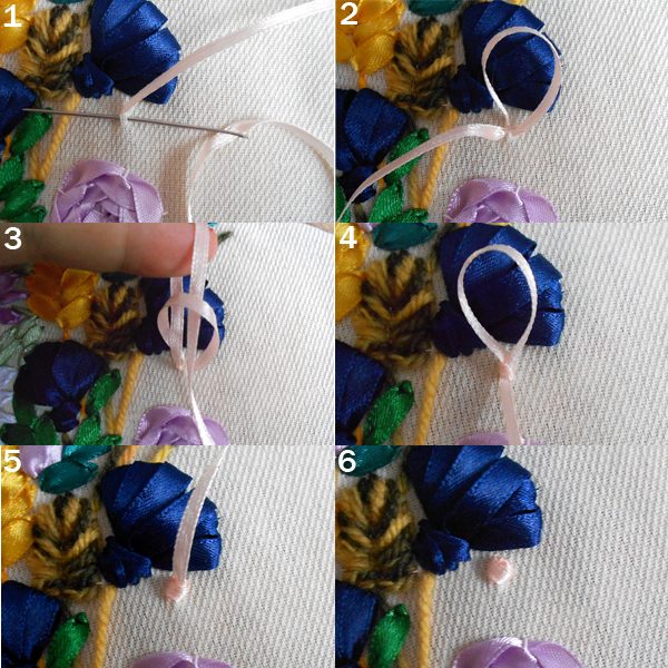 1. Выводим ленту на лицевую сторону вышивки. Захватываем пару миллиметров ткани и протягиваем иглу.2. Ленту уводим не полностью, оставляя небольшую петлю. Через эту петлю продеваем иглу с лентой.